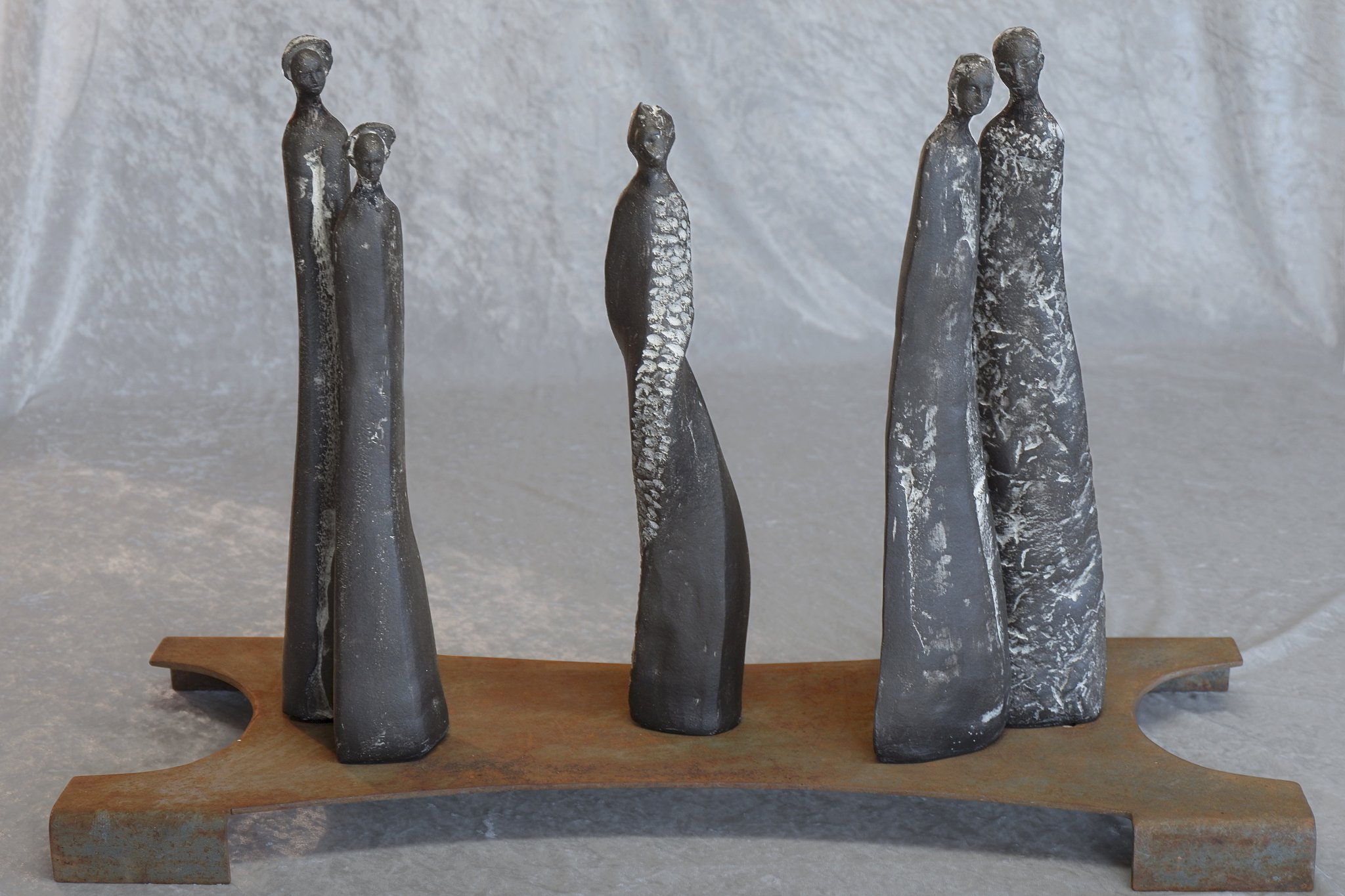 Fünf kreamische Figuren stehen in Verbindung; jede für sich und doch unausweichlich verbunden. Zwischen ihnen entsteht ein unsichtbares Spannungsfeld. Die Arbeit thematisiert menschliche Beziehungen; sichbar gemacht durch Form, Haltung, Struktur und Raum.
